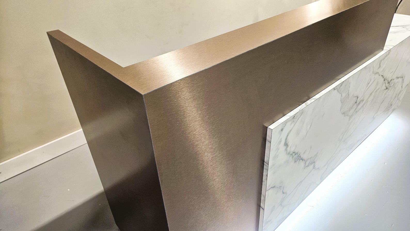 Jade Plus Reception desk ( Gloss White + Copper) Gold Metal laminate has an additional cost.